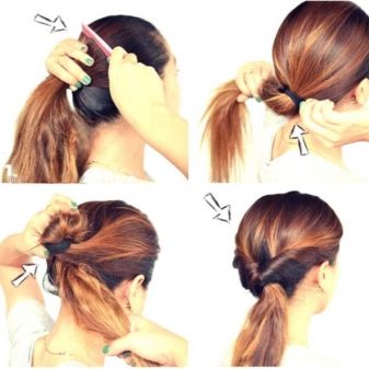 Another interesting option is the tail inside out. To create this gentle hairstyle, strands are collected from below and fixed with an elastic band, then loosened a little and pulled slightly down. Without lowering the resulting tail, the section above the rubber band is divided into two parts with the fingers and the end of the tail is pulled into the formed hole. The inverted tail is considered a self-contained haircut and does not need any additional decors.