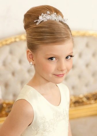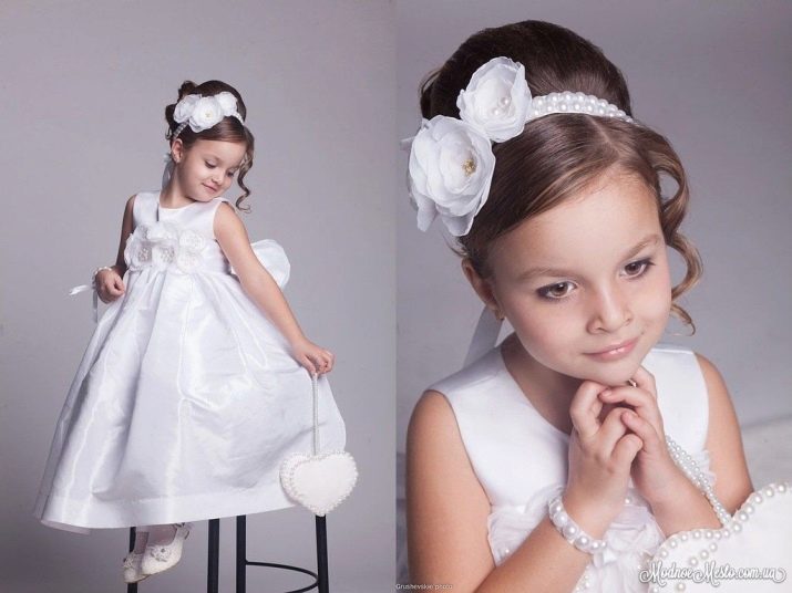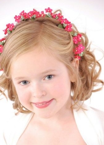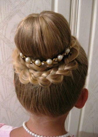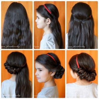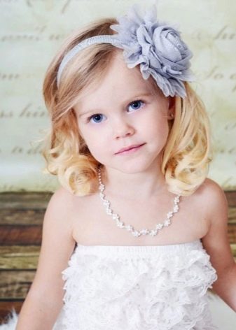 The easiest way to create a festive hairstyle for the baby is to design the hair in a gentle Greek style. To create it, you will need either an artificial braid on an elastic band or a special bandage, however, you can use a regular cord, but not silk. The cord is dressed in such a way that it is located on top of the hair, while on the forehead it should be higher than on the back of the head. All the locks are twisted, slightly combed and tucked into a bandage so that it is completely curled. A hairstyle is best obtained from medium length strands.
