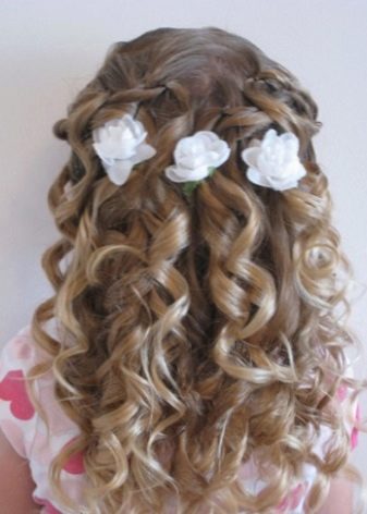 Any holiday hairstyle must be complemented with stylish decors - sparkles, bows and beautiful hairpins with flowers. If the girl’s hair is too soft and literally fly out when trying to style it, it’s better to make a regular tail and create hairstyles based on it. For owners of tight curls, funny ponytails on the top of the head are suitable - if the girl has short or medium hair - it is quite enough, but for longer strands it is better to twist it further in gulk.
