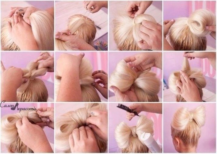 For graduation in kindergarten, you can make a bow out of hair, this hairstyle looks very impressive, and you can make it literally in 5 minutes. First you need to collect a high tail on the top of the head, but with the very last grip of the strands with an elastic band, they do not need to be pulled out to the end - you must have a small tuft and the tip of the hair, you need to stretch it in the direction of the occipital part.