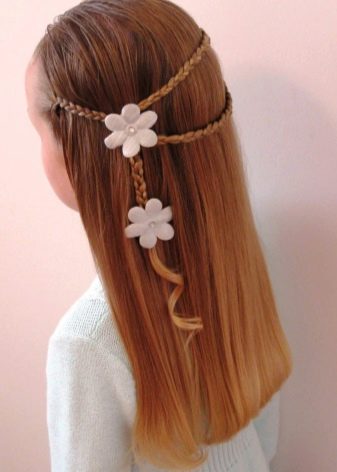 For little fashionistas with long curls, the most popular options for hairstyles are braids, since they do not allow hair to tangled and do not interfere with active classes.