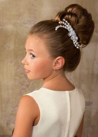 - Clamps. It can be combs, hairpins. As a rule, these accessories are decorated with artificial pebbles, rhinestones, feathers, lace elements. For festive occasions, you can choose quite massive clips, for official places (school, kindergarten) - modest, with a minimum of decor. For example, a small hairpin with one large bead.
