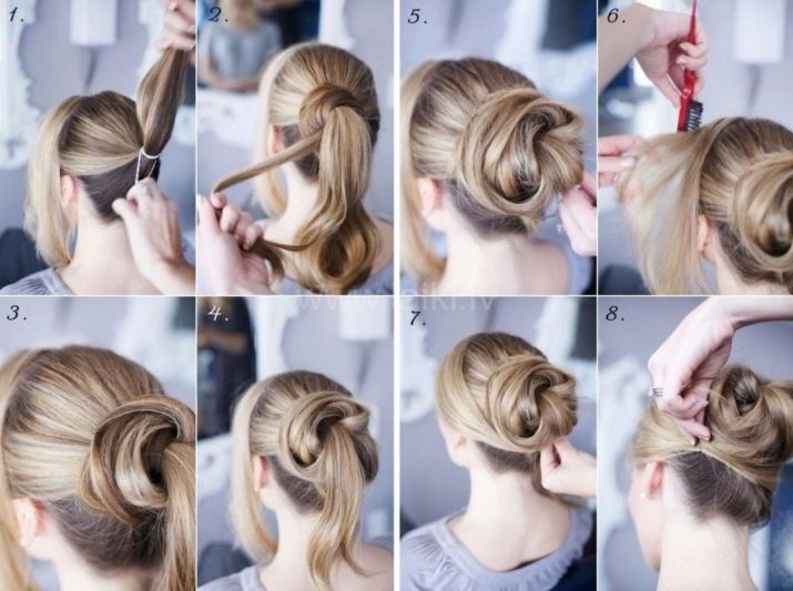 Repeat the same steps until all hair is removed. You can decorate the finished hairstyle with a small satin bow in the area of the first voluminous squiggle or decorate all voluminous loops with hairpins with rhinestones.