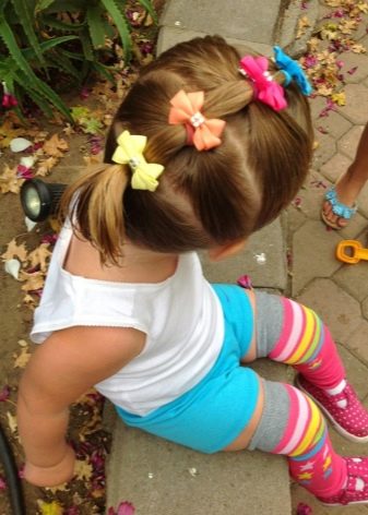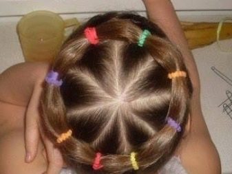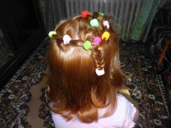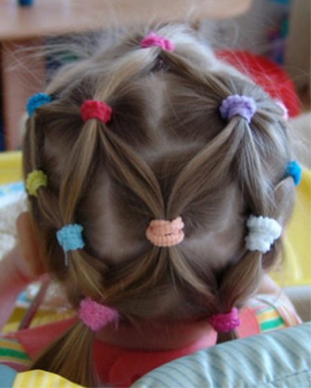 Hairstyle suitable for girls 2-3 years old. Looks perfect on rare hair. For implementation, you need to take 3-4 colored silicone rubber bands. If the child has a bang, then pre-stab it so as not to interfere.