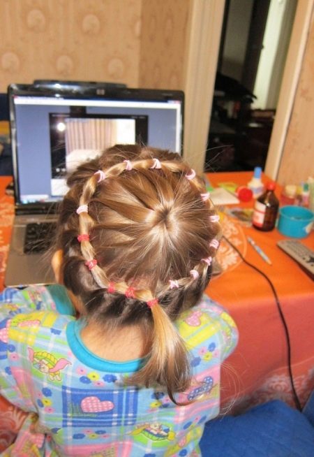Braids, tails and harnesses can be arranged, so each time a unique image is created. An example of a beautiful hairstyle is a rim of ponytails. Reliable fixation guarantees comfort to the child until the evening.