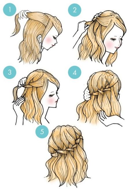 To begin, make a side part, then divide the hair in the temple area into 3 equal strands. Start making a normal braid, but leave the bottom strand free. Instead of a loose curl, take another strand from the upper hair. Sew the same bindings to the next ear.