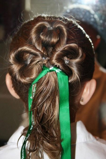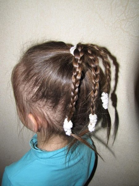 Such a hairstyle can be performed on the day when everyone slept through the kindergarten. She is very simple and fast, but her hair takes on a neat appearance. It is enough to make a high tail, divide into 2 equal strands and weave them together. Thus, you can simply remove the hair that is getting into your eyes, or arrange the entire length. You can fix the ends with rubber bands as well as hairpins. If time allows you to make a more creative hairstyle, then from one large tail you can get three pigtails.