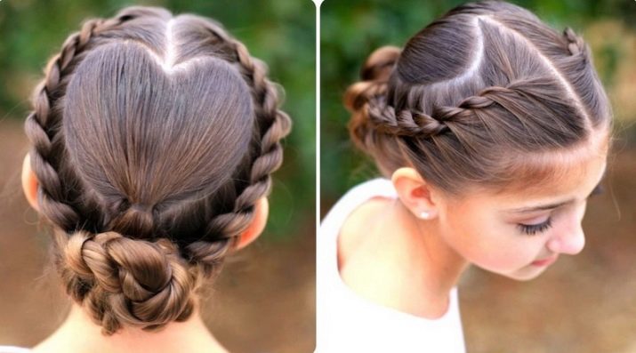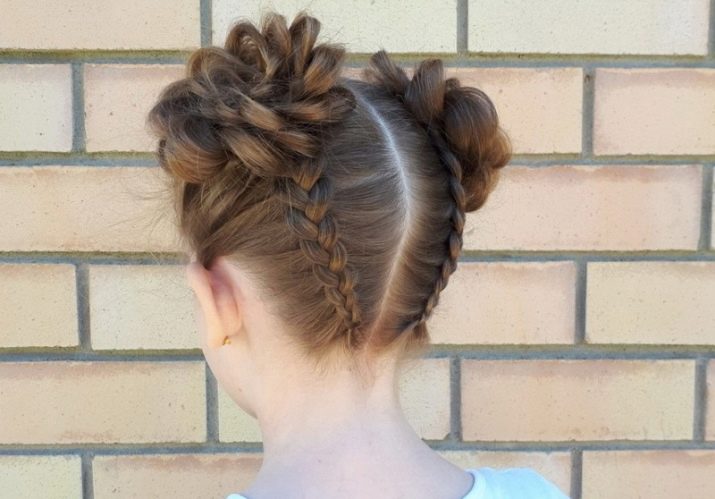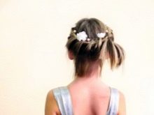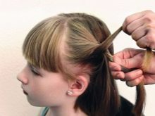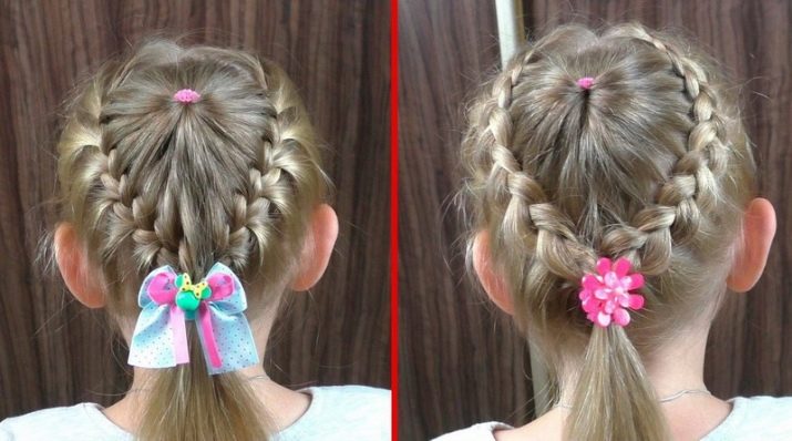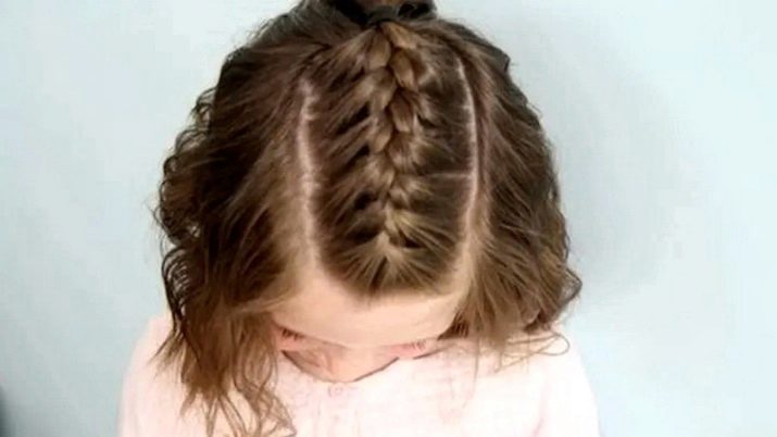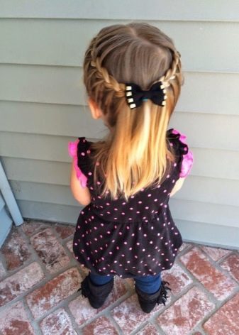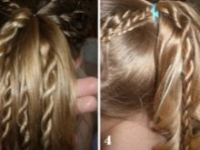If it is difficult for mother to weave a full pigtail, she can highlight two flagella above the temple, and, simultaneously including additional strands in them, weave it to the opposite temple. Even if the hair is very sparse, this will create a volume on the head, and at the same time make the hairstyle more convenient.