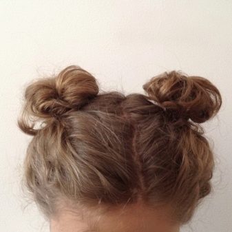 In addition to the ponytails, one of the easiest hairstyles for short hair is bunches. Gathering hair in a ponytail, at the last turn of the gum, you can not stretch the strands from it to the end to form a loop. It needs to be slightly fluffed and decorated with a ribbon. If desired, several such beams can be made, observing the symmetry in their arrangement.