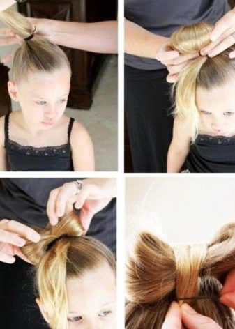 From your own strands you can make a neat bow on your head. Collect part of the hair at the back of the head in the tail. At the last turn of the elastic band, do not stretch them to the end, but divide the resulting loop into two equal parts, part the halves on opposite sides. Between them lay the free end of the tail and pin it with "invisibles."