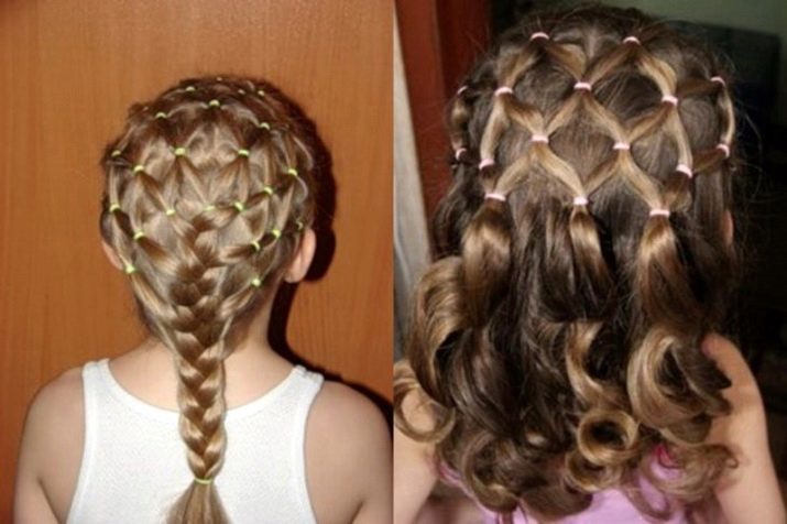 Looks spectacular styling mesh type from your own hair. It is done using a large number of silicone rubber bands. Their hair is collected in small ponytails. Each in the next row is divided in half, connected to half of the hair from the adjacent one and fixed with a new elastic band. So the net weaves all over the head. Moreover, it is better to use strands only from the upper layer of the "mane". At the end, the hair is decorated with sequins and, if necessary, strengthened with varnish.