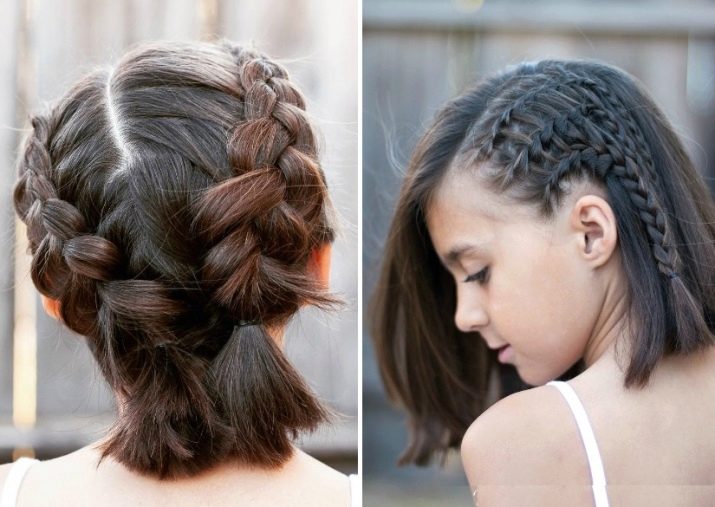 Short hair makes it possible to make a strict hairstyle for schools based on plaits at home: