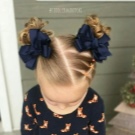 To understand how this procedure is generally performed, consider it using the example of the formation of “horns” from pigtails. To begin with, you should divide the hair into two parts with a parting in half, and the latter does not even have to be straight. After collecting the strands of each of the halves, try experimentally to determine where they are best located on the top of the head so that the girl walks, and then fix them in the chosen place with an elastic band.