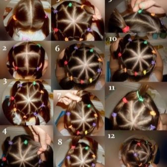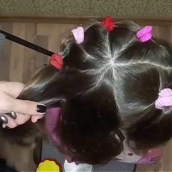 When all the hair is divided into 16 uniform parts, we tie them with elastic bands now completely. For these purposes, you can use both monophonic elastic bands and various color combinations, which will make the hairstyle even brighter and more original. The last step now is to put together all the resulting small ponytails and tie them together with one large elastic on the crown. Thanks to this solution, a significant part of the length of the hair is lost, and when assembled, they will certainly not climb into the face, and due to the abundance of gums, it is unlikely that styling will fall apart quickly even during active games.