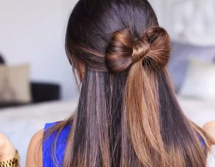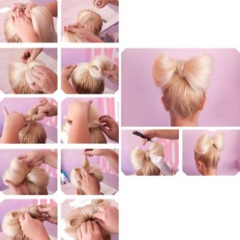 First, a tail is made from the entire mass of hair on the top of the head, but it is not completely pulled out of the gum - a loop should be obtained. We divide this loop in half, spreading its halves to the sides - this should be our bow, and we’ll tie the isthmus between them with the remaining end of the tail. For an ideal look, you can “conjure” with the ends of your hair, hiding them under the bow halves and stitching them there with “invisibles”; for a more solemn look, you can twist the bow halves a little.