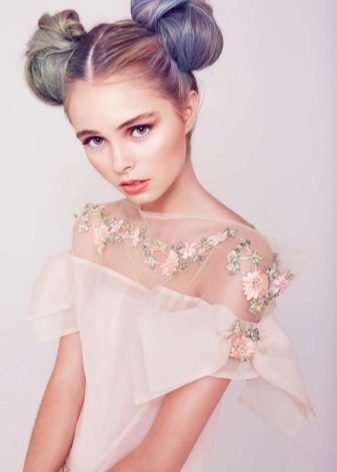 This is one of the most relevant youth hairstyles, which not only allows you to effectively collect hair, but is also very suitable for many women. Moreover, the length of the hair does not matter much, since not all hair must be enclosed in formed “bumps” - some of them can hang down from the back, without interfering with the review and complementing, making the image even more original. The most appropriate use of this type of styling for girls with an oval face shape.