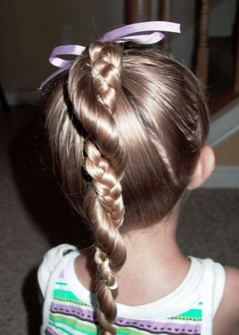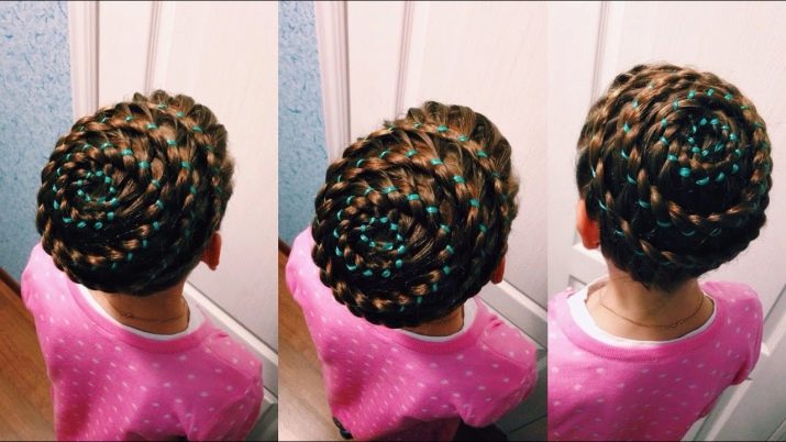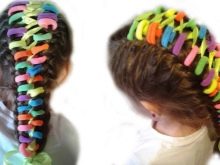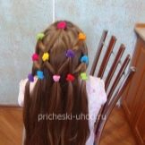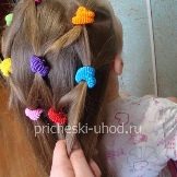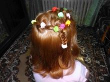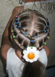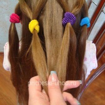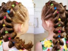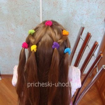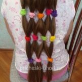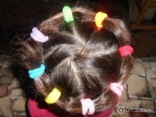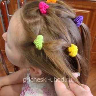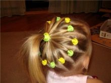 Little fashionista will love it colorful rubber bandwhich, by the way, is done in just ten minutes. All hair is separated by a longitudinal parting, after which each section is divided transversely. The resulting four parts are again divided horizontally, after which eight equal strands should be obtained. Each of them transforms into a tail fixed with rubber bands of the same color. Finally, all the tails arranged in a circle are collected in a single tail on the crown, thereby forming a wreath.
