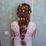 Another very simple hairstyle is also suitable for medium length hair. First of all, combed hair is separated using a parting. Following in the upper part is taken six strands that are tightened with colored accessories. Approximately in the middle part of each lock, knots are tied directly from the hair. After that, all the hair is collected in a ponytail, or the bundle remains loose.