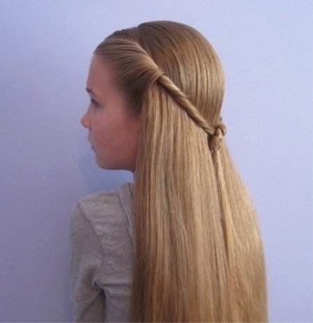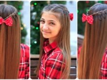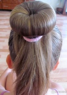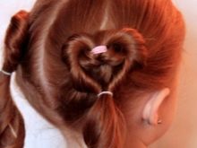 Another unusual decision will be the creation of two hearts, especially if the girl’s hair is thick and long. The whole mass is divided by parting into two identical parts and each is transformed into a tail. Then, loops are made on each side at the base, through which the ends of the hair are stretched. Having stretched this part, it must be divided into two parts, each of which is twisted into a flagellum. Having turned two harnesses into a heart, it must be secured with convenient accessories.