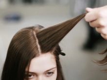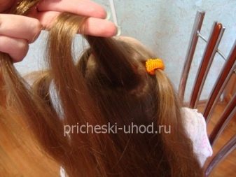 First of all, a rectangle of hair is evenly separated on one side of the head. The remaining strands can be secured with an elastic band for the duration of braiding, because they will not be needed until the end of the process. The hair that is located near the temple is divided into three identical rectangles and climbed into the ponytails.