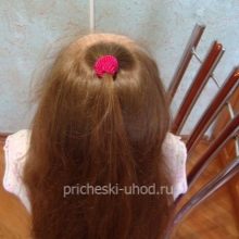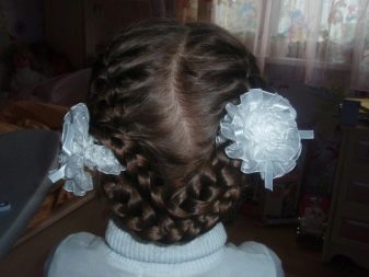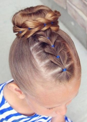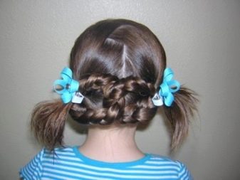 For beauty, the finished hairstyle is decorated with two elastic bands with bows.