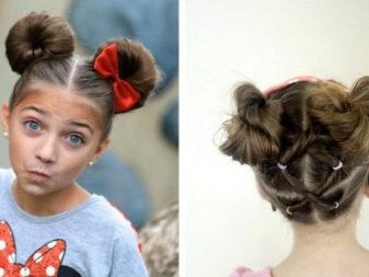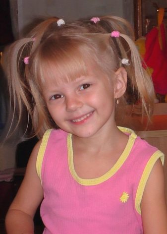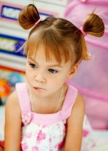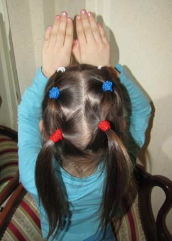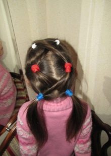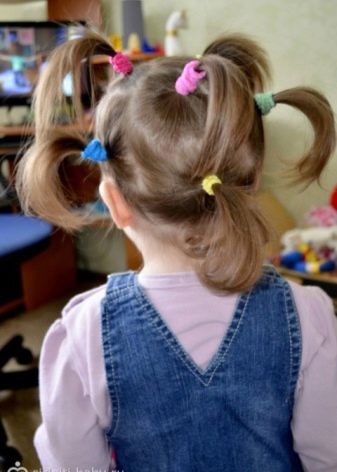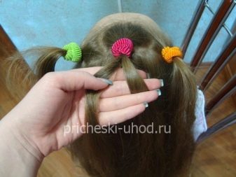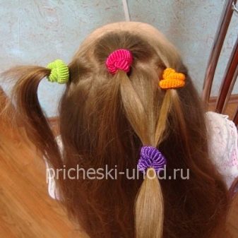 This hairstyle with ponytails makes it possible to experiment with the gum itself. They can be ordinary colored, with flowers, bows, insects and other images. It is recommended, by the way, to take braided gum, which will not get tangled in the hair, which means cause problems with further unraveling.