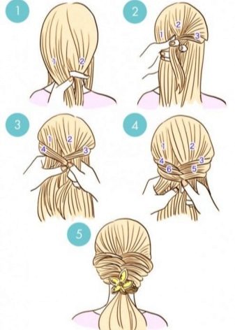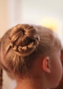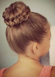 Another appropriate option would be a basket of a pair of braids. The first step is to choose a part of the hair in the crown area, from which a normal braid is braided, not going to the center of the head, but rather to the right. This part is fixed with an elastic band. The remaining hair is also braided into a braid, which is then wrapped in a bun, which can be fixed either with hairpins or with a beautiful elastic. The upper braid is wrapped around the resulting structure through the bottom, after which it is additionally fixed if necessary. If required, the end of the hair should be hidden under a bun.