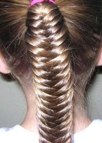 For everyday wear, the “fishtail” variation, which can be done with any hair length, is suitable. Dividing the total mass into two parts, it is necessary to separate from the sides a small identical curl. They are connected at the back with a beautiful rubber band, which then drops slightly, and the ends are threaded through the eyelet. The same should be done with the other strands. You can process all curls in this way or limit yourself to the number of weaves you want.
