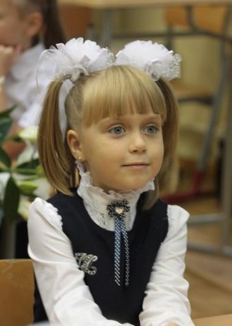 Short hair creates some restrictions for hairstyles, but suitable options still exist. The classic solution, of course, are a variety of ponytails. It is better for a young schoolgirl to collect one or two ponytails, but babies can do a few. Such a hairstyle not only allows you to quickly put your hair in order, but also, if necessary, pacify the knocked out bangs. To collect several ponytails, it is enough to divide all the hair into identical locks, and then fix them with elastic bands.
