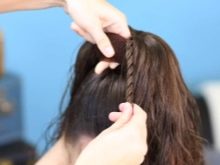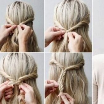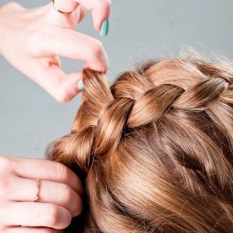 To begin with, the hair is parted into two sections with a direct parting, after which two strands are separated on one side, twisted into a cord and twisted twice.After that, from the top and bottom, more strands are captured, add them to the main harness; in this way they move around the entire circumference of the head and are gradually entwined with a “rope”. When you get to the starting point of weaving, the curls must be twisted and divided into two locks right up to the ends - according to the figure eight. Twisted locks are laid around the head in the second rows and fastened with decorative hairpins.