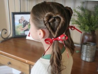 This hairstyle looks very interesting, while making it quite simple. First you need to collect two identical tails on the sides of the hair, and rotate their tips through the elastic; after that, each tail is divided into two sections, twisted into flagella and connected with elastic bands so that they create a kind of heart - this is a very elementary hairstyle, but it will certainly create a little beauty a good mood for the whole day.