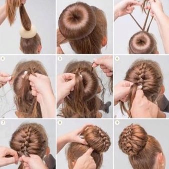 From one end, the pigtail must be assembled into a bagel so that it looks like a ring - the tips should be left on the side right behind the elastic so that they do not stick out in a chaotic manner. The second pigtail should be carefully passed through the steering wheel, then returned to the very base of the tail and secured with an elastic band.