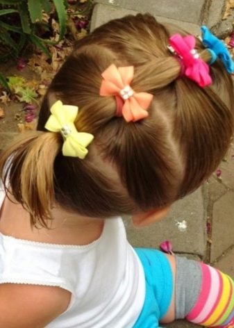 A 2-3-year-old baby, for example, is rather difficult to keep in one place - a young fashionista will spin in all directions, jumping up and going about her business during styling. At this age, the mother rather needs the hairstyle, rather than the baby herself, which is why the creation of the hairstyle, as a rule, is accompanied by burning tears, which the mother will be forced to endure, putting her curls in order. Therefore, for girls the youngest question is to do the simplest and fastest styling, for example, with ponytails - you can make two, three, four or more mischievous tails.