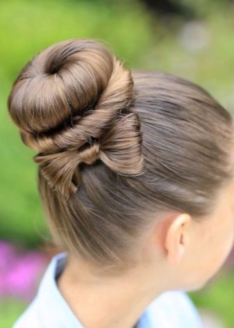 A bow made of hair looks very impressive. At first glance, it might seem that it is too difficult to arrange this hairstyle - it’s not so, even dad can cope with it, and it takes no more than 10 minutes to create it. Everything is elementary here: the hair is thoroughly combed and folded into a high tail on the back of the head, after which it is fixed with an elastic band so that the tip is not completely drawn out at the last twist. Thus, a loop and a tail are formed. The eyelet is divided into two halves and slightly bent to the head, secured with invisibility. The tail is brought out to the front side and the center of the bow is wrapped around it, the tips are removed with the help of hairpins. This hairstyle does not require any additional decors - it is attractive and original in itself.