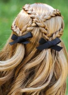 The hairstyle looks very nice, which is suitable for both a three-year-old girl and a fifteen-year-old girl with low braids crossing each other. Perhaps its charm in the use of tapes. Simplicity of execution and the possibility of everyday use are in the plus of this option. Two braids can transform into one or, conversely, turn from one into two.