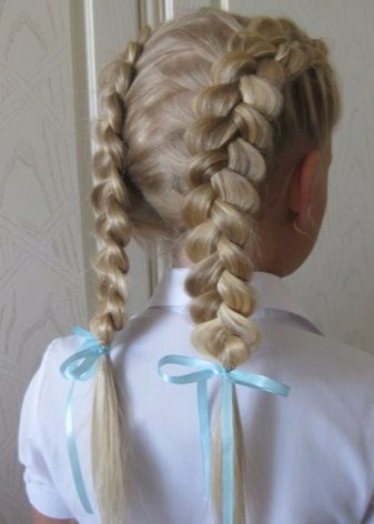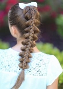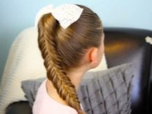 Make a middle part on your head. Divide the locks into 2 identical parts and select one thin lock from each. Both strands must be crossed with strands from its part, and then cross with each other. From one side again select a thin strand and cross with the upper strand of the resulting braid. Alternating in a similar way, the braid is braided and fixed with an elastic band. A small bow with a hairpin is fastened near the base.