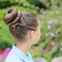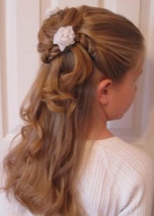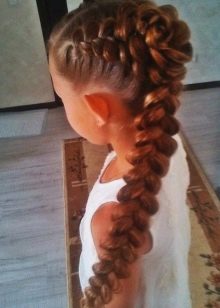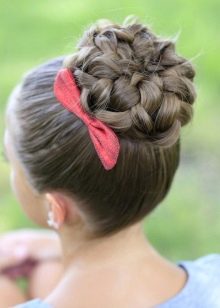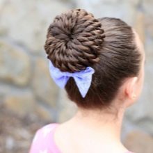This is a truly legendary hairstyle, it is usually done for some solemn occasions, it is not suitable as a child’s everyday. It is necessary to act as follows. Hair is collected from above into a high ponytail. The strands are divided into two parts of different thicknesses. A large mass of hair is combed, a lush bundle is formed and fixed in a bobbin, and not combed hair is laid on top of the entire structure and fixed with hairpins.