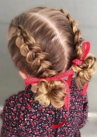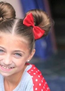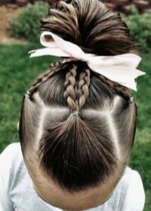 To begin with, an even straight parting is done on the head. On both sides they are separated by a thin lock from the top of the head, fixed with rubber bands or hairpins. Top pin miniature bow. This hairstyle looks especially impressive if the hair is curled a little.