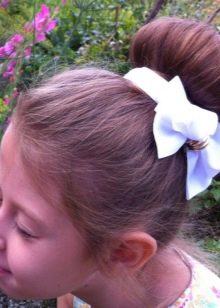 The simplest version of the solemn hairstyle for September 1 is ponytails with big bows. If the girl is the owner of a long thick hair, then you can collect the hair in one ponytail and fix it with an elastic band, and put a bow on top.