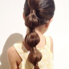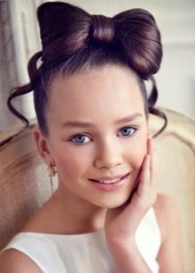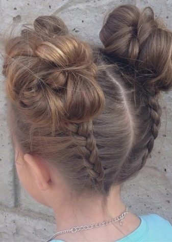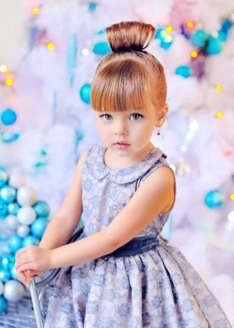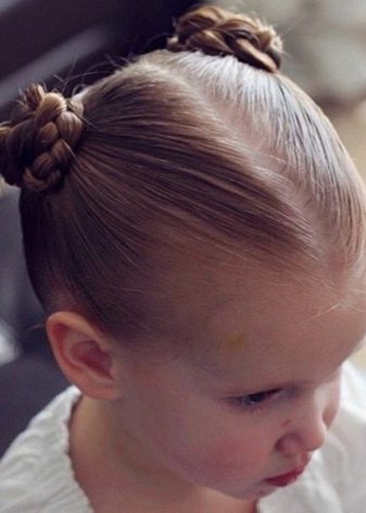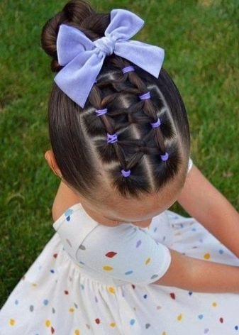 For a little girl, a hairstyle from knots and a bun is suitable. Divide the hair in the parietal and temporal zones into six parts, fix them with colored elastic bands. In the middle of each tail, make loops and tighten into knots. Collect the free part of the hair in one bundle and fix it.