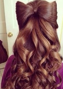 For girls aged 10-12 and older, you can make a beautiful hairstyle for a school evening based on a low tail. Hair parted from ear to ear split in two. Curly hair in the back of the head. To give curls splendor, to collect in a tail almost at the very neck. Then wind the hair in the parietal part and with an elastic band attach these curls to the tail, mask the elastic with a strand of hair. It turns out a magnificent airy design. Comb hair from the temples, then split, leaving half curls to go down at the temples, and the remaining ones wrapped slightly around them to attach to the tail.