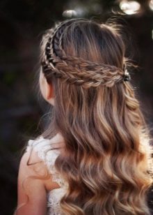 In another embodiment, the braid is placed around the head, pressing her hair so that they do not mess. Such a hairstyle is possible on very long strands, when the size of the braid is enough for a full revolution. To make a comfortable and beautiful hairstyle from long hair, a small beautiful bow is formed from strands from the temporal areas collected in the back of the head, leaving the bulk loose.