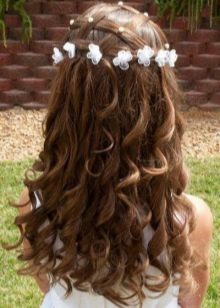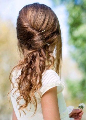 Loose hair is good because it does not create any load on the scalp of a child. At the same time, managing them is not easy. If you leave them as they are, just combing them, they will interfere with a little fidget, poke their eyes in and get confused. The smaller the girl in age, the more you have to figure out how to fix the strands in front. A beautiful hairstyle with curls can be done if the front part of the hair is braided obliquely from one temple to another, fixed with an elastic band and hide the tip under the rest of the hair. The rest of the hair curl curling, dividing into equal parts.