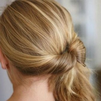 First you need to comb your hair. Select two strands of small thickness at the top. Put them in a tail at the crown. Spread your hair over the gum with your fingers and stretch your tail into this hole. It turns out that he was turned inside out. In the area of the temples, select two more strands and connect them with the tail. At the level of the new gum, part the hair again and stretch the tail through them. Now it remains to collect the remaining strands, tie with an elastic band and again twist the hair. The ends to comb. Done.