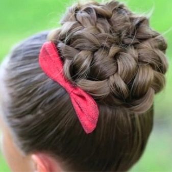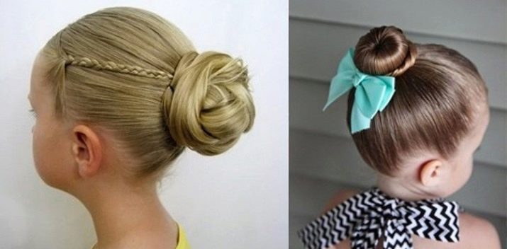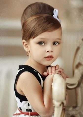 - A bundle of hair can make a young fashionista elegant. To increase the size of this element of hairstyle, an additional elastic band is put on the tail. Then the desired shape is created. Due to the competent arrangement of the strands on the bundle, they create a pronounced pattern of hair that draws attention to the hairstyle. Hairpins and bows diversify it and make it even more elegant.