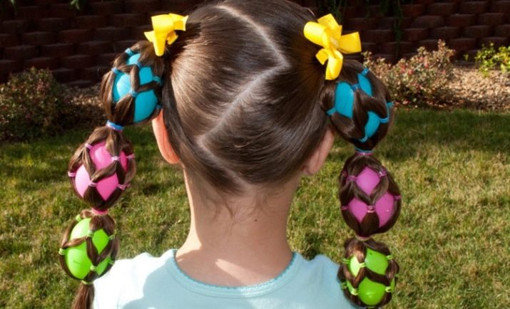 - Even if the girl has thin hair, with the help of eggs from Kinder Surprise it is possible to create a funny hairstyle. It is necessary to make an unusual parting and fold the grid of strands using a large number of small rubber bands. With a good skill, it takes a little time to form it.