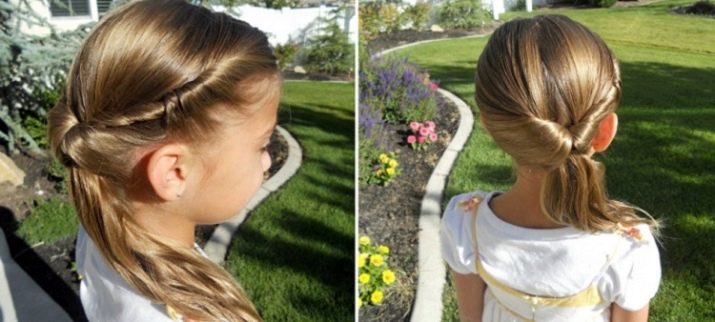 - In kindergarten or school you can make comfortable simple hairstyles using ordinary rubber bands for hair. The strands are well combed, collected in a tail and secured to the back of the head. Choose the central part of the hair and weave a braid out of it. Then it rests several times around the rest of the hair and fastens it to the end with a second rubber band. This hairstyle can be modified by wrapping its base oblique from the central part of the tail, and then securing it with hairpins.