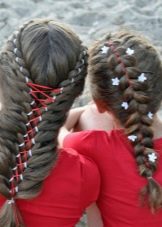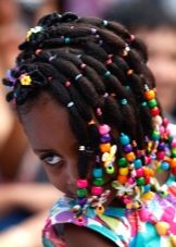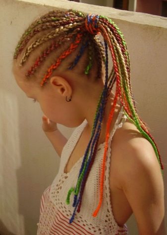 Pretty bright and elegant looks hairstyle "African braids." For their execution, additional multi-colored threads are used that are woven into strands. The work itself takes a very long time. And not every parent agrees to do such a hairstyle for his child, although during the summer holidays you can also experiment.