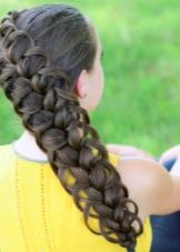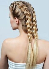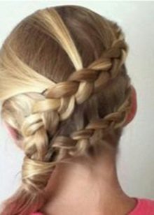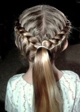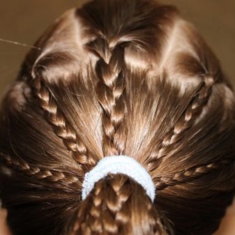 - The basis for creating this hairstyle classic braids connecting in a single tail. Laying looks very elegant, you feel the luxury and sophistication of each spikelet. With this styling, you can go not only to school, but also to any holiday events. The technology of the hairstyle itself is not difficult. Several braids are drawn at the same circumferential distance. And they smoothly flow into a whole ponytail of hair. Before you begin styling, hair must be moistened or treated with conditioner.