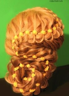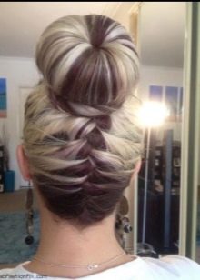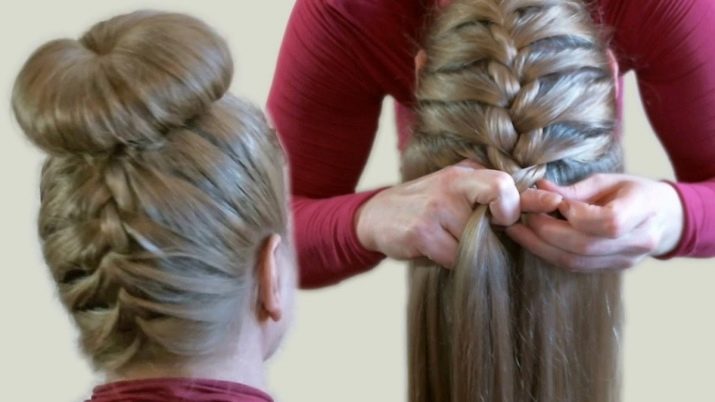 When creating this hairstyle, you can use tape weaving. And when fixing the “donut”, use the remaining ends to tie a bow.